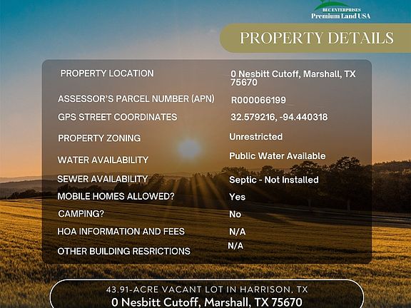 This 43.91-acre wooded property in Harrison County, Texas offers a prime opportunity for residential development, investment, or long-term land holding. Located along Nesbitt Cutoff, the parcel includes approximately 38.3 feet of paved road frontage. A deeded access strip runs approximately 2,852 feet from the road to the main portion of the property, offering a private entrance that leads deep into the interior acreage. There are no zoning restrictions in unincorporated areas of the county, allowing for a wide range of permitted uses. You can build a single-family home, modular residence, manufactured home, or even a tiny home without limitations. The land is heavily wooded with a mostly level profile, giving you options to clear selectively or maintain natural coverage. Electric service is available nearby, public water is at the property line, and a septic system will be needed for residential development. The location offers excellent connectivity. It’s just 9 minutes from Marshall, 2 minutes from Nesbitt, 17 minutes from Hallsville, and under an hour from Shreveport, Louisiana. Nearby destinations like Piney Park and Light House Entertainment offer recreational options close by, adding to the property’s appeal. Buyer is responsible for all closing costs, PERC testing, and installing all utilities (electric, water & septic). Don’t miss the chance to make it yours! Contact us today for more details.