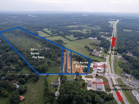 50 +/- Acres with Road Frontage of Unimproved Land. Only 11 miles from I-20 and 4 miles from Downtown Carrollton. Zoned Light Industrial in the City of Carrollton. Easy access to 61 with traffic light. All utilities are on the property with 12" water main and sewer. Additional 2 +/- Acres with Road Frontage available under separate listing.