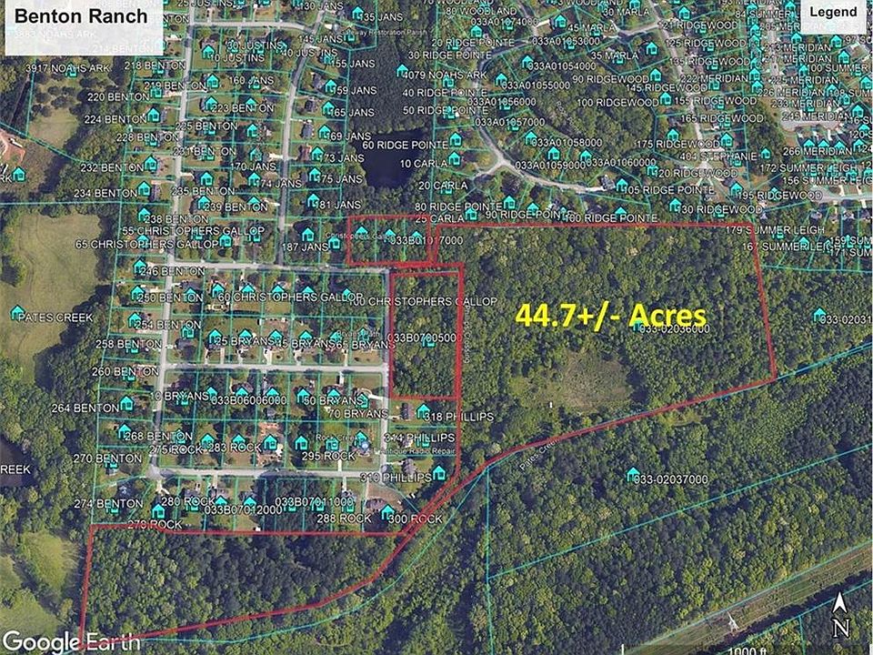 The 44.7-acre parcel is zoned residential, presenting a rare opportunity for larger-scale development project or a private estate. Nestled in the desirable Benton Ranch subdivision, this property offers a tranquil setting with easy access to major highways and city conveniences. Enjoy the freedom of no HOA, allowing flexibility for homeowners and developers alike to tailor their properties to their preferences.