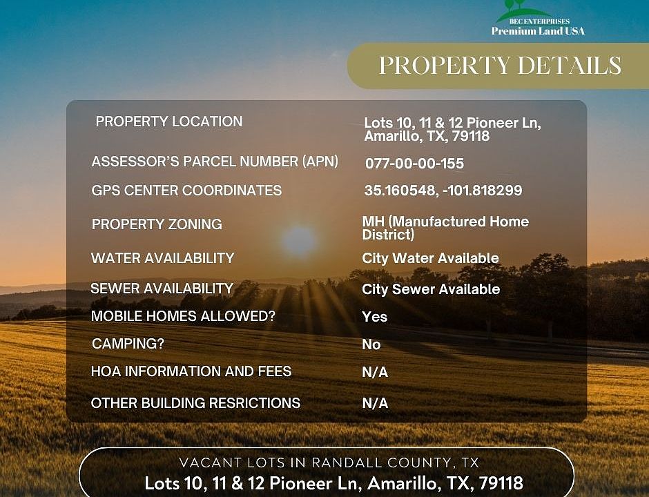Here’s a unique chance to purchase three side-by-side lots on Pioneer Lane in Amarillo, Texas! Located just southeast of downtown Amarillo with fast access to I-27 and I-40, these parcels offer excellent development flexibility in a rapidly growing area. Each lot is ready for immediate use and offers something slightly different. Lot 10 measures 0.55 acres with road frontage and plenty of space for a well-sized home or additional outdoor improvements. Lot 11, also 0.55 acres, sits in between and could work well as the center point for a larger project or standalone home. Lot 12 is a 0.51-acre corner lot, which allows for more flexible building placement & access from multiple sides. Zoned MH (Manufactured Home District), these lots allow for a variety of build types including single-family homes, modular, manufactured, mobile, & tiny homes. All three lots feature level terrain & require no clearing or grading, and all are outside any flood zone or wetland areas, making development straightforward. City water & sewer service are available, with electricity at the lot line. The property is accessed via a dirt road, providing a peaceful setting just minutes from Amarillo’s commercial corridors. Nearby landmarks include Palo Duro Canyon State Park (approx. 25 mi southeast), Wonderland Amusement Park, and the Panhandle-Plains Historical Museum in Canyon, TX. These lots offer a great blend of build versatility, infrastructure access,