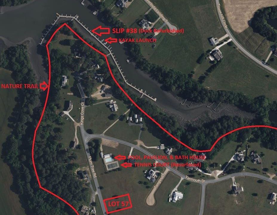 You're invited to the serene & picturesque community of Kings Creek Landing in Cape Charles, VA to build your idyllic home on a 0.46-acre lot (#57), including your own boat slip (#38) accessing Chesapeake Bay, as well as a community pool, pavilion, bathhouse, tennis court, and forested nature trail. It is located less than 5 minutes from the enchanting, historic village of Cape Charles & its bayfront beach, alluring Victorian homes, and spacious central park, teeming with quaint and eclectic shops & restaurants. A pure slice of heaven!