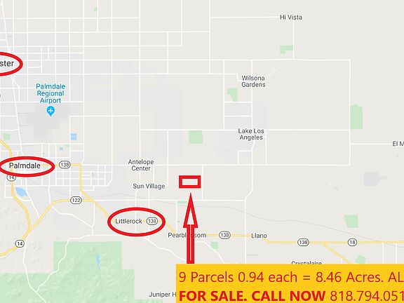 {LOW DOWN PAYMENT AND TERMS} Cheapest raw land for sale in miles. NICE LEVEL LOT READY TO BUILD YOUR HOME OR PUT A MANUFACTURED HOME ON! It contains 8 Parcels all 0.94 an acre together make an 7.52-acre lot. Paved road access. Make me an offer: 818-794-0514, about a 2-minute drive to Palmdale Blvd... If you’re interested or want to make an offer, please give me a ring using the number in this ad. Property “sold as is” buyer to conduct all inspections. If interested ask about owner financing.