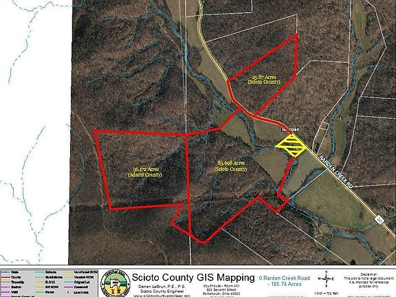 Fantastic opportunity to own 165.74 acres in an area that is home to some of the best deer hunting in the state! You can own this land and have immediate access to over 2,800 acres of state land as this property adjoins Brush Creek State Forest. Nice mixture of pasture/fields and timber. Rarden Creek runs the entire width of the property. Fresh layer of stone on driveway for easy access. Includes 3 parcels total - 2 in Scioto County and 1 in Adams County. Make this your getaway, recreational land or build your dream home on this private, serene setting.