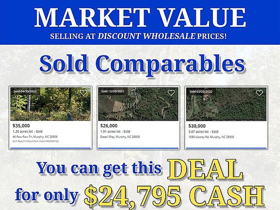 32% Below Value, 2.14ac Murphy Land SUPER SALE 2.14 Acres of vacant land located in a beautiful and serene country setting in the quiet community of Red Hawk Hills Subdivision in Murphy, NC. A private community with tons of nearby places to discover as well as great neighbors! The lot has a small creek on it and the area is near the Hiawassee Dam. You’ll find several rivers and streams close by for fishing. Pets are welcome and horses are allowed. Red Hawk Hills area boasts a very calm and peaceful country lifestyle with beautiful panoramic views of the rustic but gentle mountains, making this the perfect place to build your retirement or mountain dream home. The association restrictions are minimal, NO HOA Fees, underground power is in place and fees to maintain the roads are only $100 per year. Well and Septic are needed. ~~ Contact Lia Carnicelli to learn more: (907) 929-9888 - LandDeals4Less@gmail.com. ~~ WHY BUY?: #1. Lots of Amenities in Downtown Murphy #2. Short drive to big cities! The land is about 1.3 miles from the Tennessee border, 47 miles from Cleveland, TN, 79.3 miles from Chattanooga, TN & 119 miles from Atlanta,GA #3. Multiple Purchase Options Available! Buy with $24,795 cash! Contact for other purchase options. COMMUNITY DETAILS: This is a private community with tons of nearby places to discover as well as great neighbors! Plus the lot is near Hiawassee Dam and has a small creek on it. There are also several rivers and streams close by for fishing. In general, this area is very calm and peaceful, making it an excellent location to retire. And keep in mind that the association has minimum restrictions, NO HOA fees, only a $100 annual fee for road maintenance. Lets connect! So you can learn more about this special offer! USAGE DETAILS: - Single Family Home - RV's can be stored on property, not for living PROPERTY DETAILS: - Lot Type - Land - Sale Price - $24,795 - State - North Carolina - County - Cherokee - Assessor's Parcel Number - 451400919802000 - Property Usage - Single Family Home - Property Address - 0 Redhawk Hills Rd, Lot #: 6, Murphy, NC 28906 - Association Community - Red Hawk Hills - Size - 2.14 Acre(s) - Road Access - Yes, Unpaved - Electricity - At the Street - Well & Septic - Private - Market Value - Similar sized lots in the area have sold for upto $35,000 ACCESS DETAILS: - Redhawk Hills Rd is an unpaved road - Lot GPS Coordinates: 35.123048, -84.286754 - 75 Redhawk Hills Rd is the address to the neighbors house, which is a nearby home in the area POPULAR ATTRACTIONS: - Bear Claw Vineyards & Winery, 35 minutes away - This is a great place to go with family and friends to enjoy some live music and some great wine! - Expedition: BigFoot! The Sasquatch Museum, 41 minutes away - The museum is a super fun place to visit with all kinds of neat and interesting evidence from different places Bigfoot has been witnessed. - Fall Branch Falls, 55 minutes away - The waterfalls in this area are formed from several small cascades that eventually meet to make a 30-foot drop into a scenic mountain region pool. PURCHASE OPTIONS: We are currently offering this incredibly discounted lot at a cash price of $24,795. Financing Available - Contact for purchase options. GOT QUESTIONS? WE HAVE ANSWERS!: - Call/Email Lia Carnicelli @ (907) 929-9888, LandDeals4Less@gmail.com. - We may have other properties at bargain prices available. All you have to do is ask! - Don’t hesitate! Connect with us today while this deal is still Available! DISCLAIMER: Buyer must verify and work with County to know what can and cannot be done with the land, obtain proper permits if needed and confirm the availability of any utilities needed/serviced on the lots. Seller makes no warranties or representations about the land, its condition, or what can be built on the parcel.