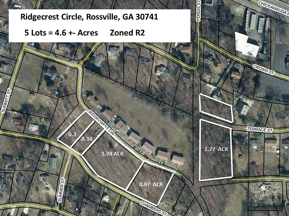 5 Lots zoned R2 totaling 4.6+- acres. Could potentially be divided into more tracts. Lots border on 4 separate roads, Ridgecrest Circle, Chambersts. Total road frontage is approx. 1295+- feet. Property is being sold as a whole. Additional lots available MLS# 1527276. All information is deemed reliable. Buyer to verify all information including restrictions, surveys, sewer, utilities, and any other information to buyer at buyer's cost.