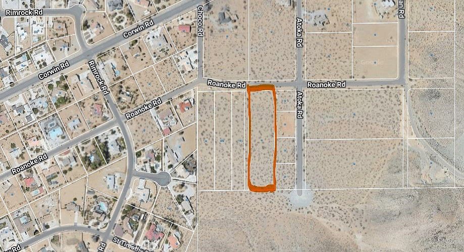 Great large lot in Desert Knolls area with a great view. New construction near this beautiful 2.3 acre home site. Perfect to build out your custom dream home and large enough for a mini estate or small ranch. Nice property in a great location of Apple Valley. Per the liberty mutual the property address is 19767 Roanoke and it already has a 1 inch water meter installed. At the Northeast corner is a water pressure reducer vault. Owner had a perc test done on the lot and sewer line is at the Northwest corner. Electrical is all underground in this area. Please verify with the town and SCE.