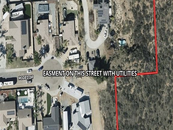 The property features legal, recorded road and utility easements providing direct access from the established Rodeo Dr. cul-de-sac and Los Coches Rd. Utilities (water, electric, sewer) are available at the street, significantly reducing development time and cost.