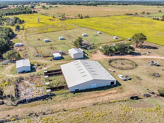 The main barn boasts a 110 x 100 indoor arena, stalls, an office, feed room, stock/wash area, and covered pens with runs. In the recent past, some alterations were made to adapt the indoor area and stalls for small-scale grow. The building inside is on a platform and can be removed; the sellers are currently working on restoring the stalls to their original design. Additional structures on the property include: 30 x 50 hay barn, a 20 x 25 goat barn, a 30 x 45 shop, and several small buildings, each measuring 15 x 20, enhancing the estate's versatility.