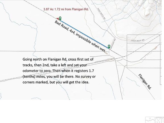 This parcel is not far from the historic Flanigan Junction and is bordered by the RR tracks. If you like vast open-land, pronghorn deer, jackrabbits and a really nice view, this may be a good one for you. Agent can get you out there, email or call him. A great deal for a parcel of land not far from a decent road-Flanigan Rd/High Rock Rd. Pyramid Lake is a 30 minute drive at most. Recorded access not verified, agent does not advocate trespass over private lands., 152+ acres near Fish Springs Ranch area of Flanigan. 1 hour north of Reno. Hwy 395 to Doyle Ca. -Doyle loop then across the creek and north on Hackstaff Rd until Ft. Sage Rd. Turn right, follow it "around the horn" and into Nevada, to Flanigan Rd. Total of about 20 miles from Doyle CA. Take Flanigan Rd across the flats to RR Tracks, cross them and then turn left at the 2nd set of tracks. Go 1.7 miles (set your car odometer to zero to make it easy). The 152 acres starts here. The 3.87 acre parcel is on the other side of the tracks. If the road is wet or snowy, don't do the RR track road, you will get stuck. Good clearance, 4x4 advised. Bring shovel, and phone.