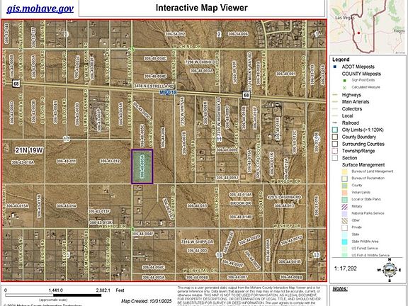 Prime property on paved Estrella Road with water line and power in street. This approx. 26 acres is located directly South of the new Dollar General Market. High visibility from heavely traveled Hwy, 68 between Kingman and Bullhead City/Laughlin.