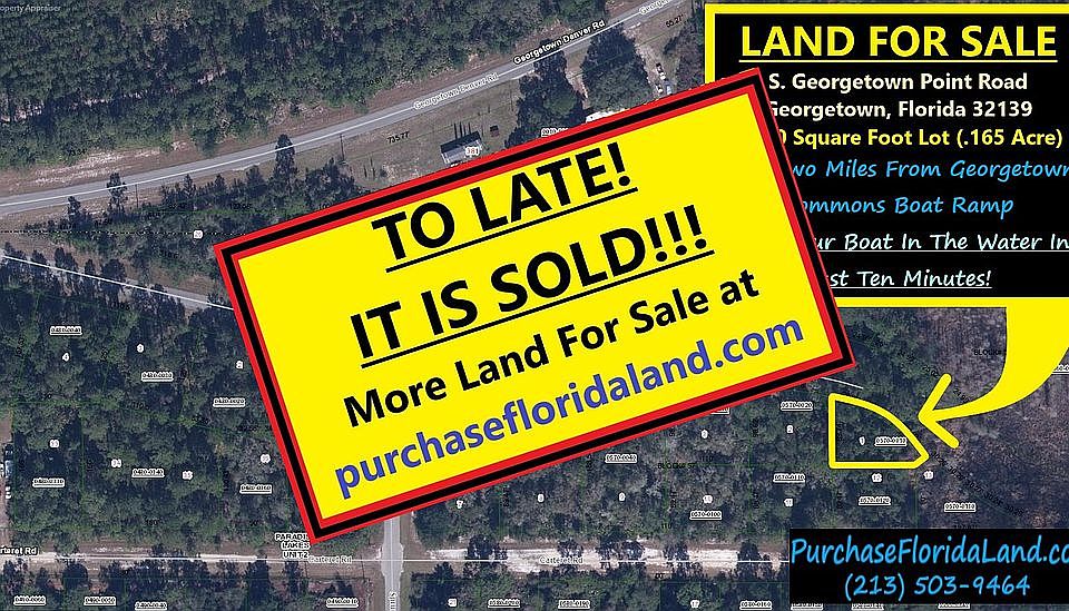 This is a great 7,210 Square foot lot (.165 Acre) on South Georgetown Point Road, Georgetown, Florida 32139 Prime Residential .165 Acre Lot For Sale by Out of State Owner! AGGRESIVELY PRICED FOR A QUICK SALE!! ACT FAST! -----First Person To Pay Will Get This Great Deal! This Lot Is In A Great Location! The Georgetown Cove Commons Area & Boat Ramp Is Only Two Miles Away! The Georgetown Cove Commons Area Has A Beautiful Pier With Bench At The End To Enjoy The View of Lake George, Picnic Tables, Fire Pit, Porta-Potty, Fish Cleaning Station, and Of Course The Boat Dock For Access To Lake George and The St Johns River! Lake George is Florida's Second Largest Lake at 6 Miles Wide and 11 Miles Long! Have Your Boat On LAKE GEORGE In Less Than Ten Minutes! Please See The Photo Showing All The Comparable Sales! This Lot's Parcel Number is # 08-13-27-7061-0570-0010 Great Investment Opportunity! or Build Your Dream Home! AGGRESIVELY PRICED FOR A QUICK SALE!! ACT FAST! ----- First Person To Pay Will Get This Great Deal! Interested? Have Questions? Don't Regret, Take Action...Give Me A Call I Will Be Happy To Talk To You! For More Info Call or Text Property Owner, My number is listed under "Property Owner" BELOW (almost to the bottom) OR Scroll All the way down To "Listing Provided By Owner" & click on "see listing website"