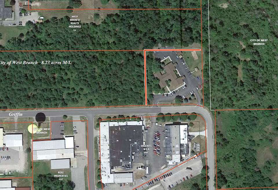 8 acres M/L located in the City of West Branch. Great location ~ corner site just across from the West Branch Industrial Park East. Paved road. City utilities available. Property split is possible. (note that property lines in overview picture are approximate).