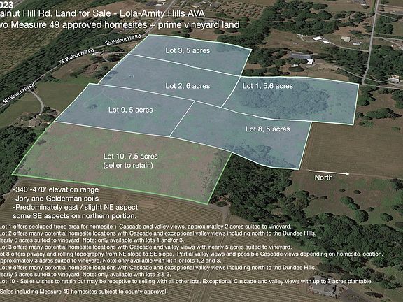2 picturesque custom homesites available on Walnut Hill Rd. in the heart of Oregon Wine Country and the Eola-Amity Hills AVA. Some flexibility on configuration and acreage size. $349k price is for Lot 1, Lot 3 is available for $439k. Additional land with vineyard suitability available, call listing broker for details. Septic evaluation complete, county approval anticipated within several weeks, well quote available, power at road. Please do not enter property without broker present.