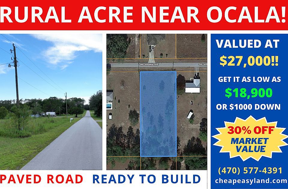 The countryside may offer the simple life – being one with nature, tranquil space, and away from the honking horns and car alarms of the city streets! Time to leave work and worries behind, and just have fun in Marion County! Cool off in crystal clear springs, zip line through the trees, explore endless trails at your own pace, and treat yourself to meals, nights, and memories you’ll be talking about for years. So if you’re looking for a place that delivers everything you need for your best vacation ever, it’s safe to say that fun starts here. Call now! Pricing Details: Discount Cash Price: $18,900 List Price: $20,790 down payment as low as $1,040 at 11.9% interest Monthly payment Options: $319/mo for 96 months $519/mo for 48 months $1,488/mo for 12 months (SAME AS CASH PRICE!) Property Details Property Address: TBA DUNNELLON, FL, 34431 Neighbors Address: 20802 SW Cardinal Ave, Dunnellon, FL 34431, USA Parcel #: 1801-021-010 County: Marion Parcel Size: 0.99 acres Legal Description: SEC 35 TWP 15 RGE 18 PLAT BOOK F PAGE 136 RAINBOW LAKES ESTATES SEC A BLK 21 LOT 10 Elevation: 105.0 feet HOA/POA: None Zoning: R-1 Single Family Dwelling Mobile Homes Allowed: Manufactured buildings (DCA approved residential units) permitted. Site Builds Allowed: Yes Campers/RVs Allowed: No Flood Zone: No Power: SECO Energy +13522374107 Water: Would need to dig a water well Sewer: Would need to install a septic system Access to Property: Paved Terrain: Level Annual tax Amount: 2021: COMBINED TAXES & ASSESSMENTS TOTAL: 157.35 Closing Doc/Prep Fee: GPS Center Coordinates: 29.13713635855354, -82.46635082337599 The four corners of the lot are at GPS Coordinates: 29.137542, -82.466577 29.137539, -82.466155 29.136665, -82.466151 29.136662, -82.466574