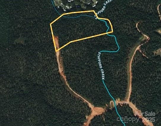 Lot 186 offers 13.97± surveyed acres within the gated Waterfront Club community on Lake Rhodhiss. With approximately 400 feet of creek front along Stanford Creek—property line extending to the center of the stream—this tract provides a rare combination of privacy, water access, and potential for both a homesite and recreation.