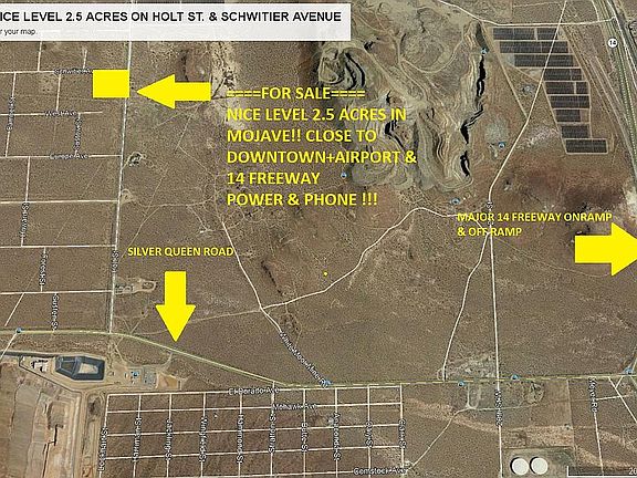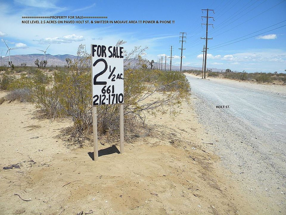 ***NICE MOJAVE LOCATION NEAR GOLDEN QUEEN MINE !!! ***LEVEL 2.5 ACRES ON PAVED HOLT ST. & SCHWITIER AVENUE !! ***JUST 2 MINUTES TO MAJOR 14 FREEWAY & SHOPPING !!! ***PAVED ROAD FRONTAGE & POWER & PHONE AT PROPERTY !! ***PRICED LOW TO SELL BY OWNER $16,500 !!!