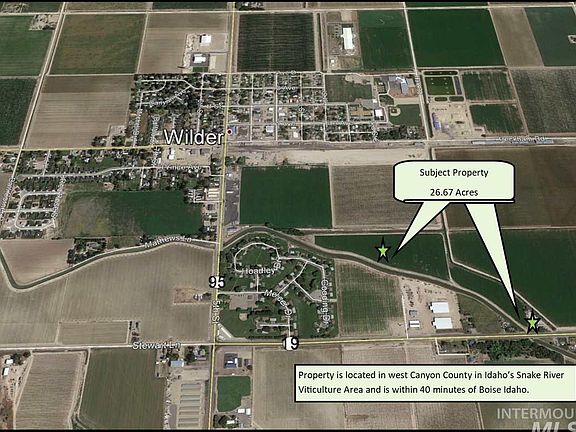 Developer opportunity for 26.67 Acres in Wilder. Property fronts State Highway 19/Simplot Blvd., near corner of Hwy 95 & Hwy 19. Part of property is zoned R2 in county and remainder Ag. Currently in Wilder City Area of Impact. Future Land Use in comp plan is CI Commercial/Industrial, manufacturing, food store, gas station, bank, church, motel, mobile home park, retail are permitted uses.. Includes 30x40 Shop. Well and Septic installed - Wilder Irr Water Rights – BTVA