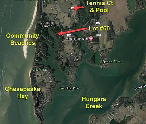 Vaucluse Shore is a development on the bayside of the Eastern Shore which has a community Boat Ramp, Tennis Courts, Pool, and long Sandy Beaches on the Chesapeake Bay. They have a very active Homeowners Association. Check out their website at If you are looking for a waterfront homesite here is a nice wooded site on Hungar's Creek. The site appears to have a high bank which will give your dream home great views out the creek toward the Chesapeake Bay. The amenities that you will have access to in this community will be such a benefit and are all just minutes away, Enjoy leisurely walks, bike rides or hop in your golf cart. Just imagine the beautiful sunsets that you will be able to enjoy while living here. Don't let this opportunity slip through your fingers.