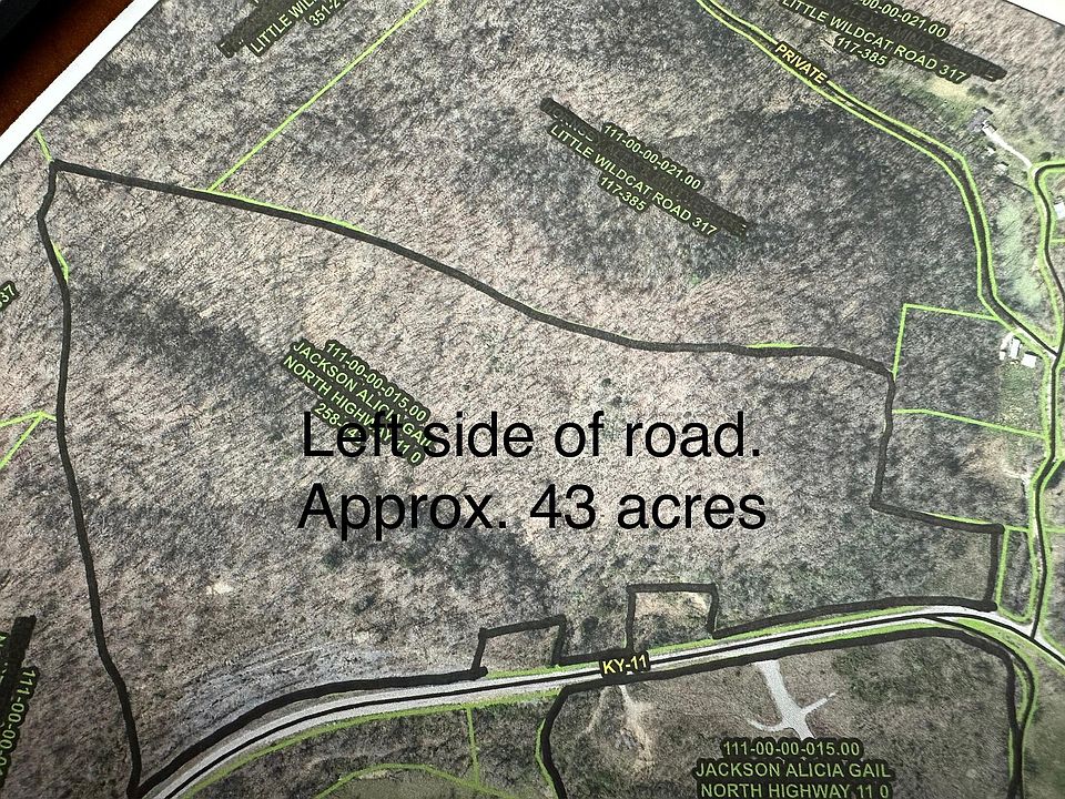 This property consists of 54.3 acres of unrestricted vacant land on N Hwy 11. Property consists of 2 sections/ both sides of the road. Left side of road the land is hills, trees (approx 43 acres) and the right side is level (approx 11 acres) It has 2 old driveways into it. Right side section borders Goose Creek on the main back side.- due to Goose Creek bordering this section on the back side, that part is flood zone A but the property is elevated above creek level. The part across the road is not in flood zone For reference, you can google 4967 and 5674 N Ky 11 addresses - 4967 is on the left just before property begins and 5674 is just past the parcel on the right. Right side parcel is divided by Beech Creek Road- a county road. The parcel on the left ends just before Little Wildcat Rd The land could be used for residential or recreational. Land is grown up- covered in either trees or brush and needs clearing or excavating for full use of property.