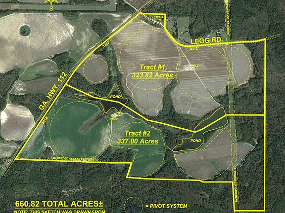 **ONLINE REAL ESTATE AUCTION - Price Determined By Competitive Bidding. Online Bidding Ends Thursday, April 10, 2025 at 2:00 PM.** We are pleased to announce the online public Auction of The Grass Farm, a highly irrigated row crop farm in Turner County, Georgia. This productive agricultural property offers fertile farmland, advanced irrigation pivot systems, merchantable timber, and excellent hunting opportunities for farmers, investors, and outdoorsman alike. The Grass Farm is comprised of two tracts totaling an impressive 661+/- acres. With 418+/- acres in row crop production, this property is 63% tillable. The irrigated farmland totals 320+/- acres, driving the irrigated production acreage to 76%, while 98+/- acres are dry farmland. The farm improvements include two stocked irrigation ponds spanning 23+/- acres. The ponds are equipped with (2) electric pumping units and (1) diesel motor servicing water to the pivot systems. This property is armed with (11) pivot irrigation systems featuring (3) two-tower pivots, (2) three-tower pivots, (3) four-tower pivots, and (3) five-tower pivots. More irrigation and water improvements include (2) 12-inch deep wells, and (1) 4-inch deep well ensuring efficient water distribution for optimal crop production. The property features predominantly Fuquay and Leefield loamy soils, making it extremely well-suited for row crop farming. The farm is also equipped with a 40' x 60' equipment shelter, offering ample storage for machinery and tools. Beyond its agricultural attributes, the farm includes 218+/- acres of timber with beautiful hardwoods bottoms and food plots, offering additional recreational use. In addition to its farming and timber resources, the farm is an outstanding hunting property, with abundant deer, duck, and turkey populations. The farm benefits from an excellent location with frontage on Highway 112 East and Legg Road. It is situated just 4+/- miles from Interstate I-75. Ashburn, Georgia, is only six miles away, while Tifton, Georgia is approximately 24+/- miles from the property. This farm is a remarkable opportunity for those looking to expand their farming operation, invest in agricultural land, or acquire a premier hunting property. Do not miss your chance to bid on a high-quality, income-producing farm. Offered divided and as a whole, REGISTER NOW on our website.