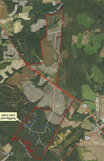 683.1 acre farm for sale outside of Leggett in Edgecombe County, North Carolina. The property includes two tax parcels (278.8 and 404.3 acres) spanning both sides of Highway 33. The farm features 241 acres of cropland, 142 acres of 2019 loblolly pine plantation, 297 acres of mid-aged and mature timber, 6,190 feet of frontage along Highway 33 and 7,600 feet of frontage along Swift Creek. The property generates an annual income of $45,000 from existing farm and hunting leases, which can be continued by the new owner. The southern parcel includes mid-aged and mature timber ranging from mature mixed hardwoods in the Swift Creek bottomland to mature and mid-aged pines and hardwoods on the uplands. The timber has not been cruised, but a recent timber inspection estimates an approximate value of $250,000±. The 142 acre pine plantation on the northern parcel can be thinned in approximately eight years, producing another income for the new owner. Additional potential sources of income include sand mining and wetland mitigation on the southern parcel. The cropland is comprised of loam and sandy-loam soils including Dga, Ro, GoA, NoA, RaA and WaB soil types. Because of the very wet spring, the fields were left fallow, but they will be planted in wheat this September. Access throughout the farm is provided by miles of truck/SUV roads and smaller ATV paths. The property benefits from low property taxes through the Forestry/Agriculture Present Use Value program. This tax status can transfer to the new owner at closing, providing significant property tax savings. Past timber management activities have created diverse wildlife habitat, including mature hardwood bottomland along Swift Creek, mature upland pine stands, young pine stands with early successional understory, and sloughs that may be suitable for duck hunting. County water and electricity are located along the road front. Sewer is located about ½ a mile toward Leggett. The farm is located 8 miles to Tarboro and the Kingsboro Mega Site, 15 miles to Rocky Mount and 20 miles to Interstate 95. Under a hunting lease. From October 1 through January 1, showings must be set up through the agent and done mid-day.