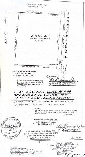 Five acre lot with easy access to Cumberland Courthouse area and Farmville.