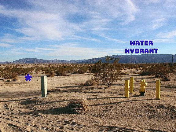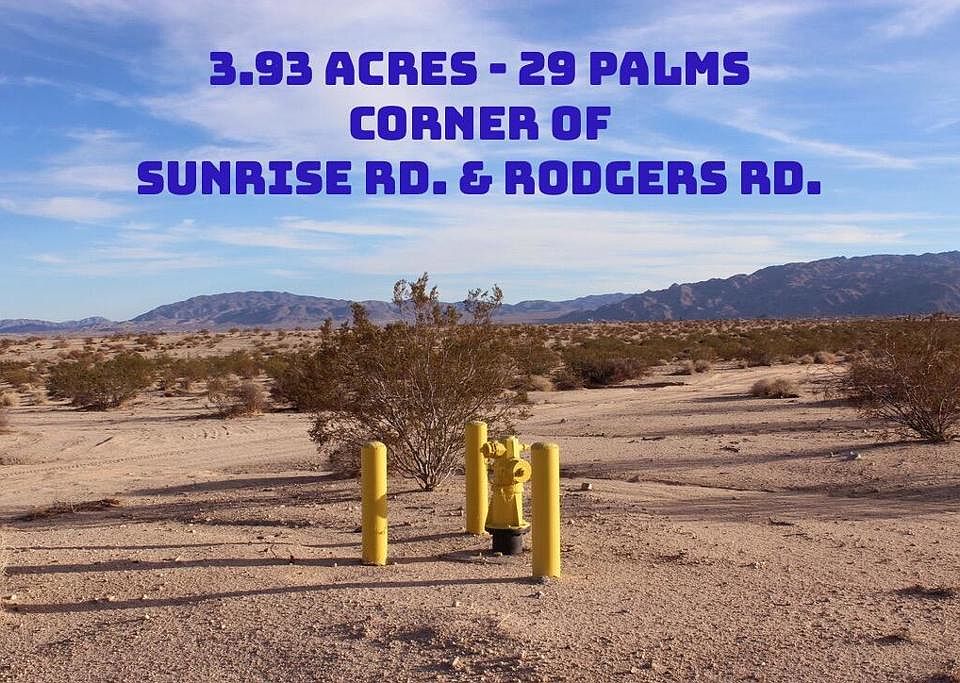SUNRISE ROAD, 29 PALMS: PRICE $22,000.00 - This is a 3.93 Acres parcel but has an additional acreage that surrounds the parcel map that is government land perhaps for a future street that will never happen, making the lot really like 5 acres. On corner of Rodgers Rd. Slightly slopping hill on property makes is a great location for a future home or farm. Horses and cows and dogs would like living here. Electric and water are to the land in the street making it ready to build on. Fire Hydrant across the street. Dimensions are 282 X 593 irregular = 171,190 Sq. Ft. = 3.93 Acres. Owner Will Carry a loan with 20% down $4,400.00 a 1st Trust Deed of $17,600.00 amortized over 5 years payable $348.50 per month + $15.00 loan service fee. APN#0611-291-44-0000.DIRECTIONS: From Hwy 62 go north on Lear Avenue then right on Indian Avenue then left on Sunrise Road go north about a mile parcel is on Southwest corner of Sunrise Road and Rodger Road - look for sign.