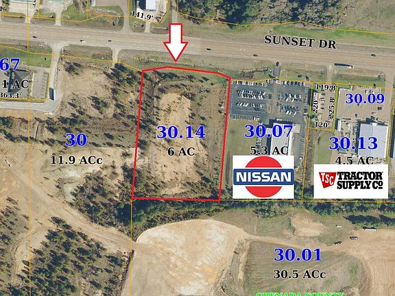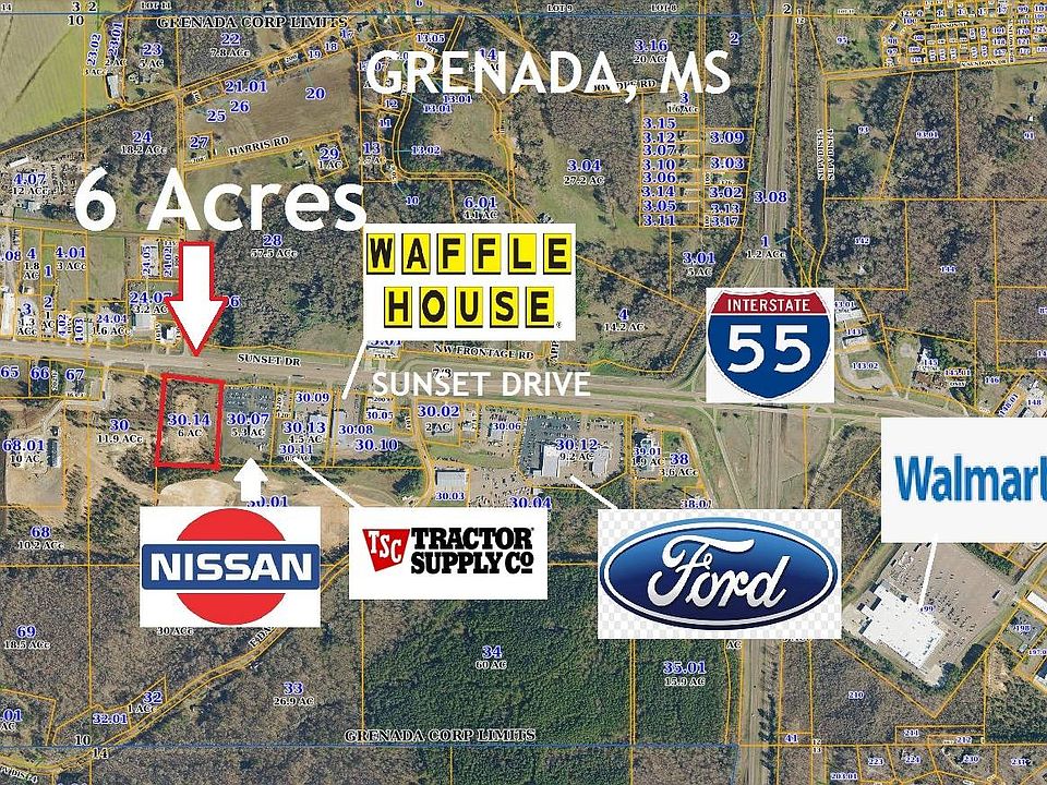 Prime 6-acre commercial parcel on Sunset Drive in Grenada, MS featuring approximately 420 feet of frontage adjacent to Grenada Nissan, Tractor Supply, and Waffle House, with a John Deere dealership and a new apartment complex nearby. Zoned CMU-2 (Commercial Mixed Use-2), this site offers high-flexibility for retail, service, office or mixed-use. Positioned just 1/2 mile from I-55 Exit 206, traffic counts in the corridor exceed 19,000 vehicles per day. Tap into Grenada's growth in the northern Mississippi region with premier interstate access, regional manufacturing investment, and a growing workforce. Ideal for businesses seeking visibility, accessibility and momentum.