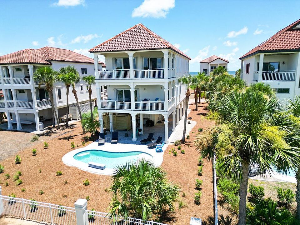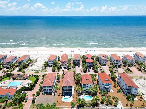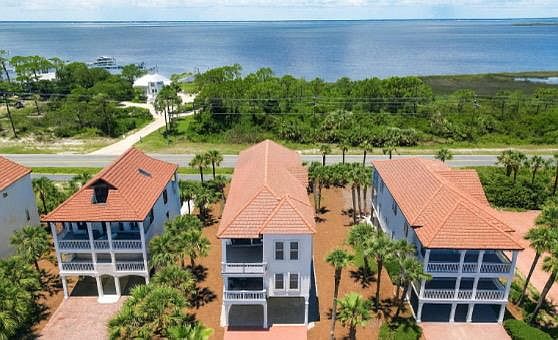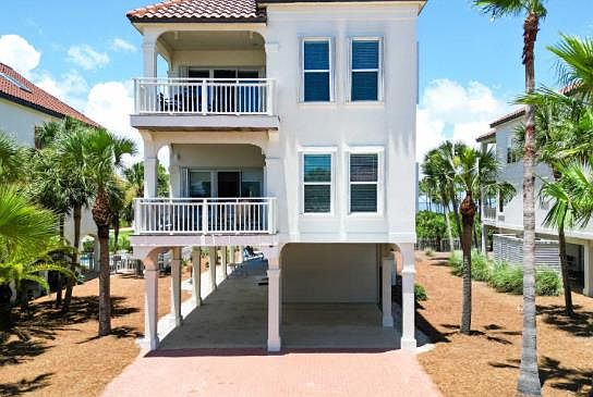1818 Sunset Drive is a Mediterranean-inspired residence in the prestigious Sunset Beach community, offering refined luxury just steps from the shoreline. This 5-bedroom, 5.5-bath home has been completely renovated with an emphasis on elegance and comfort, featuring four king suites and a custom bunk room, each with a beautifully updated private bath, including one with a separate soaking tub and shower. Every bedroom opens to its own private balcony, framing sweeping gulf and bay views. The interiors showcase fresh designer finishes, an expansive living area with dual sitting spaces, a sleek new electric fireplace, and a gourmet kitchen appointed with granite countertops. Outdoors, a brand-new heated pool with a dedicated poolside bathroom and shower creates a private resort experience rarely found in Sunset Beach, all enhanced by meticulously maintained stucco and thoughtfully selected flooring of ceramic tile and luxury LVP. The residence is serviced by an elevator to every floor and sits less than 100 feet from the beach boardwalk, with access to community amenities including a resort-style pool and tennis court. Offered fully turn-key and positioned as a premier rental property, it is projected to generate over $140,000 in 2026 gross income, combining sophisticated coastal living with exceptional investment potential.