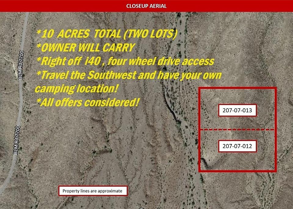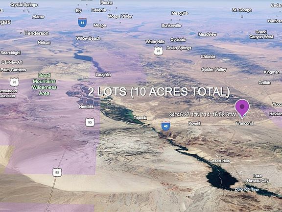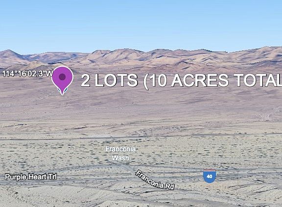10 acres right off i40...Great for camping, perfect for privacy and a four wheel drive vehicle. Bring the toys and tents for your personal overnight spot on your trips to Lake Havasu! This is 2 lots, both 5 acres each! Exit Franconia road off i40 and head North over the railroad tracks. GPS coordinates of the lots are 34.760312, -114.267317 Google map location is here: https://maps.app.goo.gl/WFWKkswBmWCtqm5U9 Railroad crossing location is here: https://maps.app.goo.gl/YKexB7rfqWbx5otp8 Please visit the property anytime with a four wheel drive vehicle. Use caution on dirt roads. Make an offer!