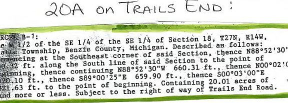 Beautiful wooded lot with Sleeping Bear National Lakeshore at the West lot line. Trails End is a short, plowed County Rd. Build your dream home on a rare 20 acre lot, or split and sell half to finance your construction. Only want to buy 10 acres? Seller may be willing to split into 10 acre parcels for the right price. Could be certified organic as no chemicals have been used in over 30 years. This is parcel #12 in Section 18 on the Plat Map.