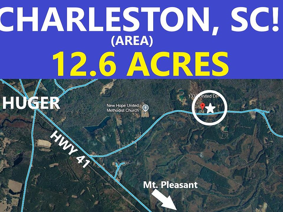 ***OVER 12.5 ACRE - HOMESITE - UNDER 300K - ONLY 35 MINUTES FROM CHARLESTON, SC!!! --- Set in an extremely peaceful, off-the-beaten-path location in the quaint town of Huger. Just minutes from everything Charleston has to offer and close to MOUNT PLEASANT with all of it's amenities! Shopping, dining, Hospitals, Beaches, Boating! - Yet in a country setting! --- Build your custom dream home today, and avoid the traffic, and high prices!! -- We estimate approx. 2.5 acres of Upland High Acres at the front of the acreage, with some possible wetlands towards the back, which yields to wildlife and privacy galore! (Priced accordingly!)****PLEASE NOTE! - No studies have been done - ALL the information we have been able to obtain from the sellers, and any/all third-party organizations, including but not limited to city/county and other entities, has been posted to this MLS (under "Documents"). If you do not see the item in question (Plat, Survey, Wetlands JD's, Elevation Cert, Etc., it is because we do NOT have them. -- Unless specifically noted, these items in question, will be the buyer's responsibility, either during the DD period or post-closing. Thank you. - Buyer is responsible for all utilities DD and tap fees.