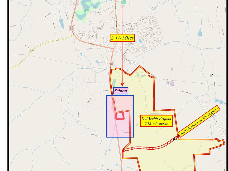 Rare opportunity to own a Prime Tract of Real Estate in a rapidly growing area. Ideal for Commercial Projects, Institutional Projects, Private Estate Buyers, Investors, and Developers. Located just 2 miles from the Pittsboro Circle, this beautifully wooded 5.06 acre property sits directly on US Highway 15-501 and borders the new Del Webb at Chatham Park Development. Access is provided via a private deeded easement. Currently zoned Rural Agricultural (R-A), offering a wide range of potential uses. **Please respect the Owners' Privacy and make an Appointment for Showing.**