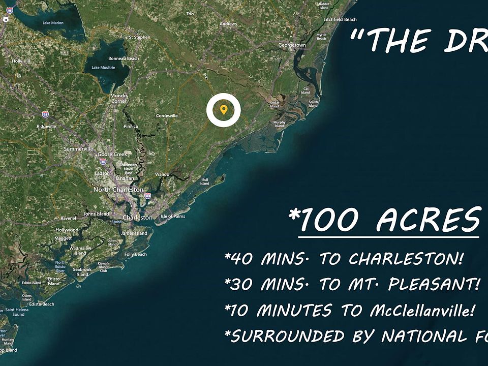 ** ''THE DREAM'' ** That's right! We are talking APPROX. 100 ACRES of the most pristine nature you could ever imagine! **Totally surrounded by the Francis Marion National Forest! Can you say QUIET?? -- But wait!! You are ONLY 30 Minutes from Mt. Pleasant (Charleston, SC) and just 10 minutes from the shops, restaurants, and boat landing in the quaint village of McClellanville! ***This Out-Door-Enthusiast's Dream of a property will make some lucky individual an extremely PRIVATE, SECLUDED, AMAZING GET-A-WAY / FAMILY COUMPOUND / HUNTING LODGE / HORSE FARM / RANCH / HOME!! (Surrounded by THOUSANDS OF ACRES of Federally protected forest!!!) You name it, you think it, you can now OWN IT! - DO NOT DRIVE ON ANY PART OF THIS PROPERTY PLEASE. Please do not enter neighboring Parcels !!****** Utilities.... Electricity is at road, buyer to verify. Will be Well & Septic, Buyer to verify and responsible for all costs. NO Surveys or studies on file, (RAW LAND) buyer to be responsible if so desired.