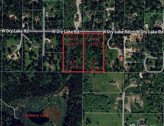 Owned by the same family since 1965. Shy of 10 acres of property on beautiful Camano Island! Here's a great opportunity for generational homesteding. 2 lots that are 4.77 each and side by side. Lots are being sold together. W Dry Lake Rd. frontage with easy access to Ivy-Drylake Trailhead, and Cross Island Trail. A short jont to Cama Beach State Park. Lower lot will have wet lands and is ajacent to Cranberry Lake. Mature trees have potential for added timber revenue. Both lots were selectively logged at one point many years ago. Come check out all that Camano Island has to offer. Use Power poles as reference to property boundry. -3810 is between 17 & 18. -4150 is between 18 & 19. Parcel # is marked on the road.