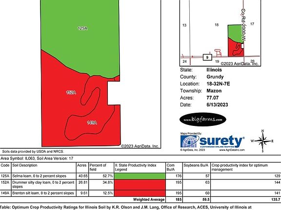 This 78 acres located just outside of Mazon, IL offers great access with frontage on W Grand Ridge Road & S Hadden Road and sitting only 2.2 miles from IL Route 47 which can take you to I-80 or I-55 in about 18 minutes. The property is composed of a single vacant parcel, no buildings, 77.0 tillable acres, a soil PI of 135.7, and is located right next to a Grainco FS facility.