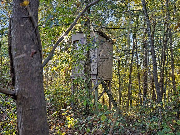 Private recreational landFood plotsRolling to rugged terrainEstablished trailsSeasonal creeksThree box blindsMature hardwoods