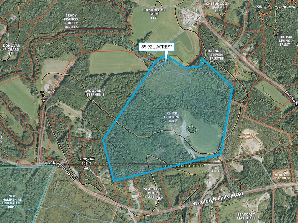 85.92± acre relatively flat land parcel available for sale, with approximately 6.0 of those acres located in the Town of Newmarket. Residential (Zone A) zoning includes permitted uses such as: single family and duplex houses with accessory dwelling units, agriculture, and recreational. 7.0± acres are actively farmed for corn, 4.0± acres are lightly mined for gravel, and the balance of the lot is mostly undeveloped wooded area. The Lee gravel pit is part of Newmarket Sand and Gravel, a division of Chick Trucking, Inc., which provides washed sand and stone for construction, industrial, and residential uses. Site was surveyed in 2025 for material and 137,620 cubic yards of loam and fill are present. A full survey and materials breakdown are available upon request.