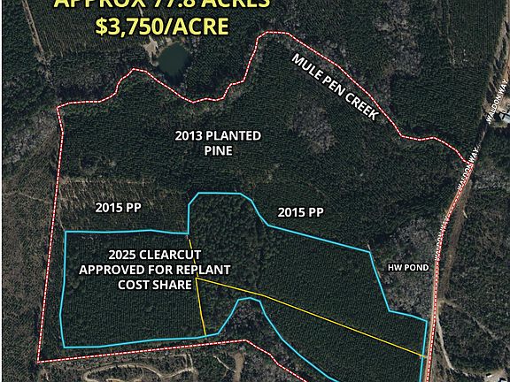 Approximately 77.8 acres located is West Emanuel County, Georgia. The property is has Pine Plantations, cleared areas and hardwood ponds. A creek borders the property on the north. 29 acres was harvested and is scheduled to be replanted in a cost share program which can be assigned to new owners. This is a great getaway retreat, hunting and recreation property. The property can be inspected from Walden Way but no entry into property is allowed without permission from Agent. The property is currently leased for hunting through July 2026 and that lease would be transferred to buyer. Contact M. Jeremy Coulter 912-687-2042 (Phone/Text) or mjcoulter1976@gmail.com for more information.