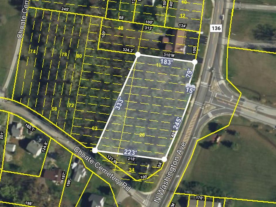 4.12 acres in two tracts. 1.48 acres on N Washington zoned CL and 2.64 acres on Choate Cemetery Rd zoned RS-20. Road frontage on N Washington is 323 ft and frontage on Choate Cemetery Rd is 334 ft for a total of 657 ft. Sewer is at Vickers Lane per City of Cookeville.