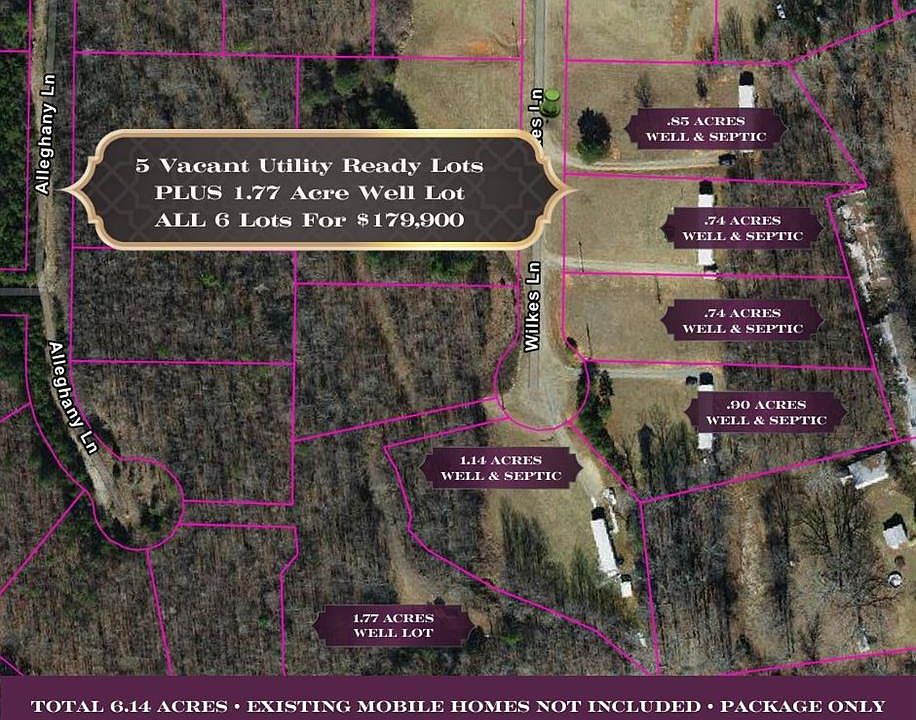Fantastic investment opportunity in Pilot Mountain. This listing includes six contiguous parcels totaling approx 6.14 acres, including a 1.77-acre well lot that provides water to five improved lots. Four mobile homes currently on site will be removed before closing, and two may be purchased separately. Each improved lot already has well water and septic in place, offering cleared, build-ready sites perfect for single-wide or double-wide manufactured homes, rentals, or small community development. The remaining parcels in the neighborhood will be listed separately for buyers wanting to expand. Quiet, well-kept area with the main water line running along Wilkes Lane for future utility options. Minutes to Hwy 52 and downtown Pilot Mountain.