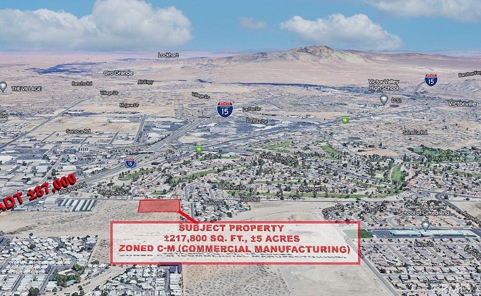 ±5 acre Vacant Land Offering zoned C-M (Commercial Manufacturing) allowing for a wide array of service commercial and light industrial uses. Examples of permitted uses include but not limited to: furniture manufacturing, textile, apparel, research service & laboratory, financial institution, equipment sales & rental, office, etc. Centrally located within the City of Victorville, less than 1,000 linear feet east of Interstate 15 and less than a mile drive to access the freeway via Palmdale Rd. The future of the High Desert Region shines bright – proposed projects such as the High-Speed Rail Line to Las Vegas and the BNSF Barstow International Gateway facility are just two pending developments which have the capability to springboard values in the local market. Get in on the ground floor and invest now.