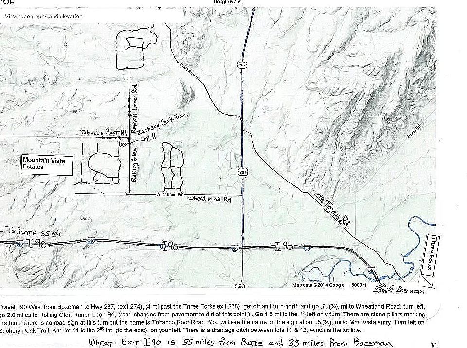 2.02 acre building lot with views of Gallatin valley and surrounding mountain ranges. Lot no. 11 Mountain Vista Estates. Beautiful neighborhood just off Hwy 287 with several new homes and with open space and 3-acre pond for private recreational use. A quiet private area with wide open spaces, mountain views, rolling hills and wildlife. Just minutes from Three Forks (59752) and an easy 35-mile drive to Bozeman on Hwy 90. and only 20 min to Belgrade. Easy to build on, good hwy access, yet quiet and peaceful. Power and phone ready to connect. Great recreation access with lakes and rivers nearby including Canyon Ferry reservoir and Headwaters state park. Here is a link: it's an excellent interactive Google map overview (shows my lot in Mtn Vista . . . as you pan back out to see a larger view of the area you can see Dunbar road to Wheatland road to 287 and back to I-90) .....Select-copy-and paste this address in your browser. ..... Note: Google doesn?t have this marked on maps but the satellite view from this link clearly shows Mtn Vista sub-division is there. Lot 11 is the 2nd lot on the left as you pull on to Zachery Peak Trail. When you send inquires for this add include your email address.