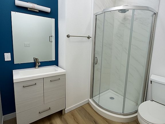 Sleek quartz countertopsCeiling fanShaker cabinetryRenovated studioVinyl click-flooringCeramic tile shower