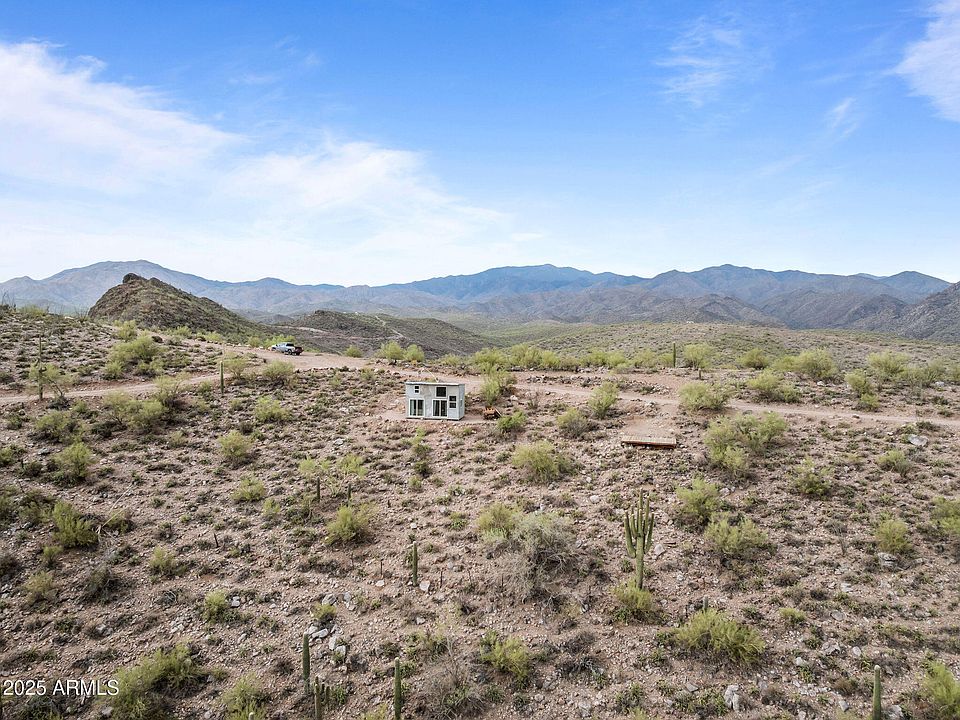 Breathtaking 10-acre parcel with panoramic views of Lake Pleasant, Crown King, 4 Peaks, Cow Creek Dam, and the Phoenix Valley. Perched at 2,700' elevation, this off-grid retreat offers privacy, tranquility, and stunning desert scenery just over 4 miles from Peoria city limits. Usable terrain includes a large, level dirt pad with two entrances, perfect for RVs or trailers, plus a campsite with a 10' x 20' deck. Enclosed shed with windows captures cool breezes and lake views. Ideal for weekend escapes or building your dream getaway. Accessible by 4WD. No utilities—perfect for solar/off-grid living.
