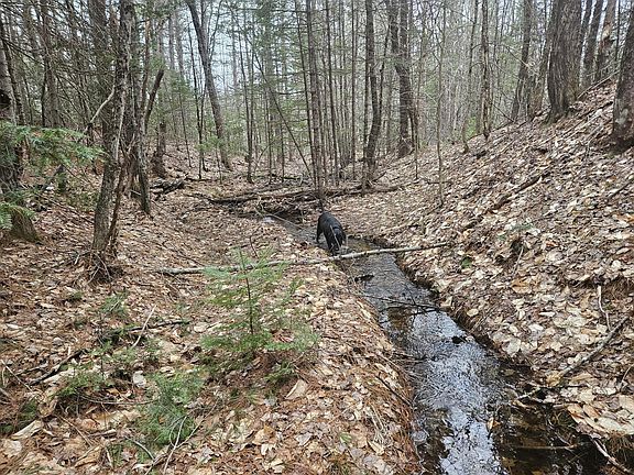 The lot includes frontage along Greeley Brook and surrounding wetland which provide valuable wildlife habitat. For those considering development, the land features higher, drier ground along New Harrison Road, which is the deed states as having approximately 1,400 feet of road frontage. A preliminary soil test completed by a prior owner indicated that the lot meets state minimum standards for an on-site septic system, although prospective buyers may wish to conduct updated testing to confirm.