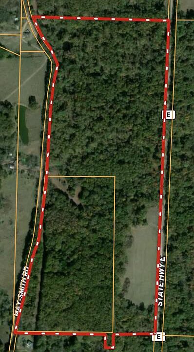 Land for Sale in the Ozarks with GREAT LOCATION. This 64 ac m/l runs from Road to Road with over 2600 running ft on State Hwy E AND 2600 running ft of road frontage on May-Smith. Land is wooded with an open hayfield. Cattle tight fence ready to turn your livestock out. There are 4 ponds scattered and electricity on the property. Great place to build a home or cabin (with excellent hunting) to get away. Located only 10 min. off 4 lane Hwy 60, but offers privacy, peace & quite. Close to area rivers, lakes, streams and National Forest. Live in the Ozarks where YOU own your land with NO RESTRICTIONS! ACCESS-POWER-LOCATION-PRIVACY-