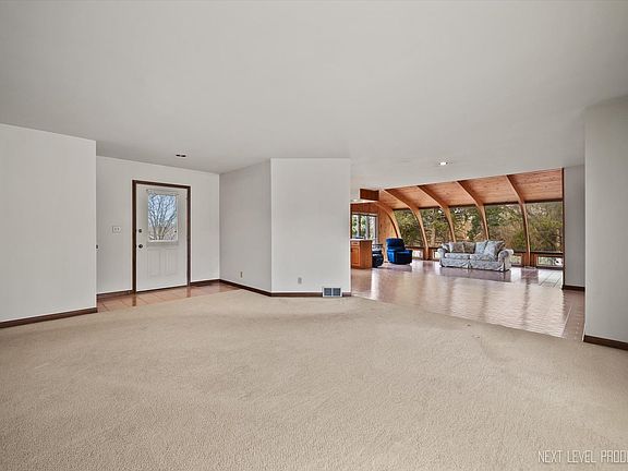 All brick custom ranch on a private wooded cul-de-sac lot! You will love the large room sizes and open concept floor plan! The living room has a cozy floor to ceiling brick fireplace and opens to the spacious eat-in kitchen...the eat-in kitchen offers solid oak cabinetry and a big center island. The kitchen opens to the heart of the home - the impressive 20 x 16 sunroom with knotty pine barrel vaulted ceiling, stunning views of the yard through the floor to ceiling windows and an atrium door that opens to the deck. The main level laundry room has abundant cabinets and washer/dryer. The primary bedroom suite is spacious and has dual en-suite baths, one with a shower, the other with a deep soaker tub. Bedroom two has a large wall closet. Full hall bath with linen cabinet and shower/tub combo. There is a full unfinished walk-out basement with unlimited possibilities! The gorgeous property is full of big mature trees! This home is located just minutes from the Rte 47 & I-88 interchange, downtown, local shopping...and schools are nearby as well!