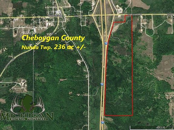 Contact agent button does NOT get you to that agent. Located in Cheboygan County just off the exit in Wolverine with frontage on Main St. and I-75. At approximately 236 ac, this diverse tract features a great trail system through the rolling hills and open field areas. There is a creek and a couple small ponds in between the stands of Spruce, Pine, Aspen and hardwoods. Over the years this property has produced some fantastic whitetails and elk along with the occasional bear sighting. There is a smaller rustic log cabin and several blinds on site. Outside of hunting the seller has been approached for commercial and residential opportunities due to the location. Many possibilities for this one! *Maps contained on our sites are there to simply depict the over all layout or shape of a given property and show what it looks like from an aerial view. These maps are neither a legally recorded map, or any type of a legal survey and should never be used as such. Also "Acreage" amounts are displayed as according to the information we have obtained through local government and are in no way guaranteed or warranted to be exact**