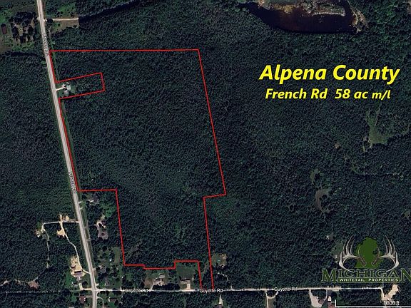 Located in Alpena County less than 5 miles from the North side of Alpena. This vacant land totals approximately 58 ac m/l and has access from both French and Guyotte Rd. The habitat is pretty thick with mostly Spruce, Pine and Cedar trees. Some trails are already on the property that start from the Guyotte Rd access. Still time to get into this one for this deer season. ***Maps contained on our sites are there to simply depict the over all layout or shape of a given property and show what it looks like from an aerial view. These maps are neither a legally recorded map, or any type of a legal survey and should never be used as such. Also "Acreage" amounts are displayed as according to the information we have obtained through local government and are in no way guaranteed or warranted to be exact**